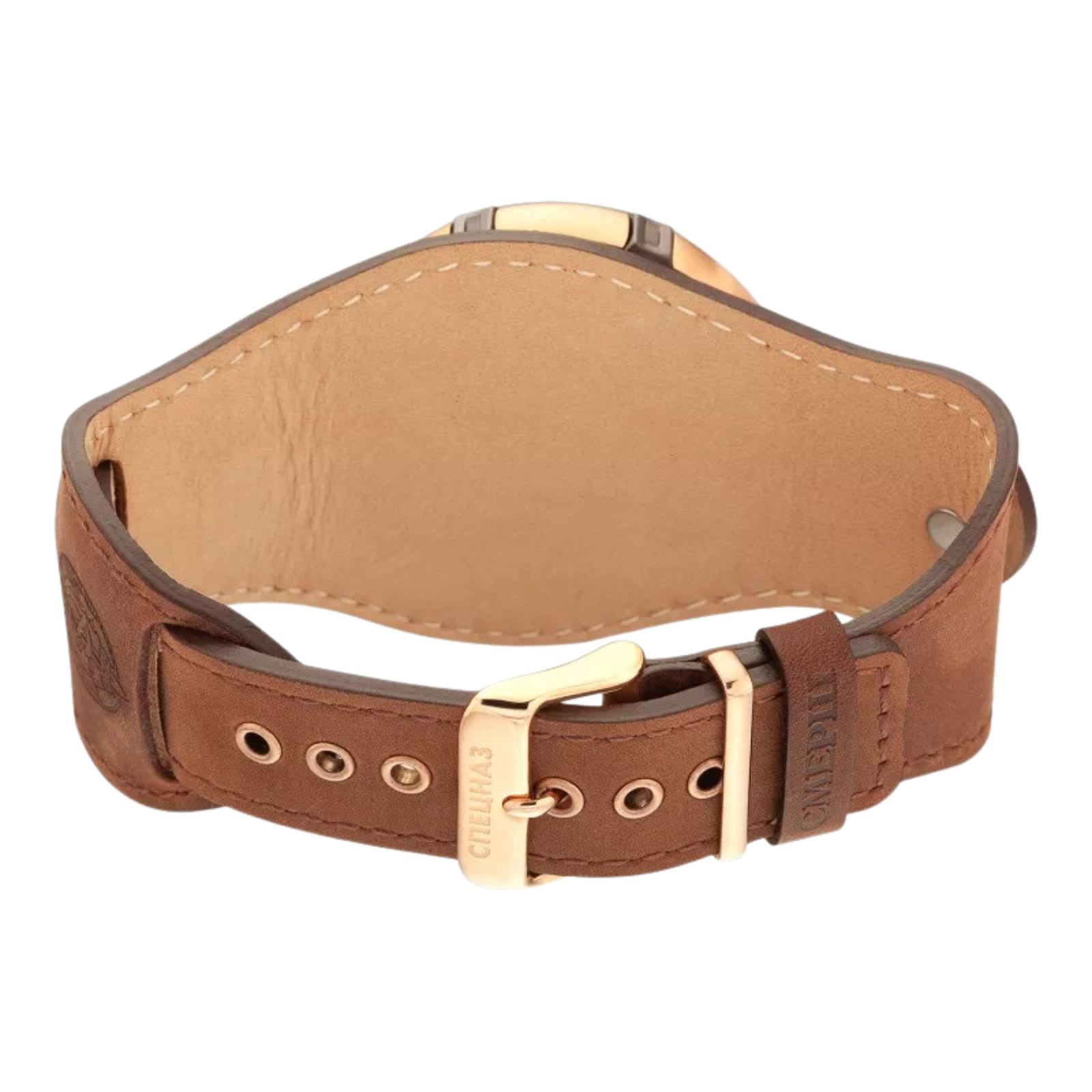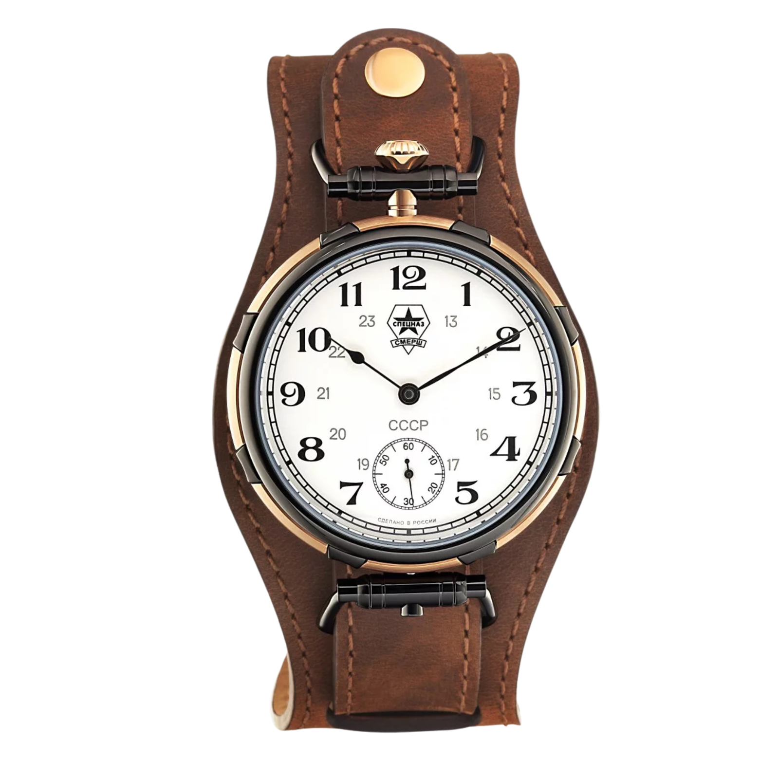 The Spetsnaz “Smersh” is a classic men’s mechanical wristwatch powered by a precise Caliber 3603 manual-winding movement. Featuring a 46mm steel case with a unique brown/gold finish, a sapphire crystal, and 10 ATM water resistance, its highlight is the convertible design that allows it to be worn on the wrist or carried as a pocket watch.