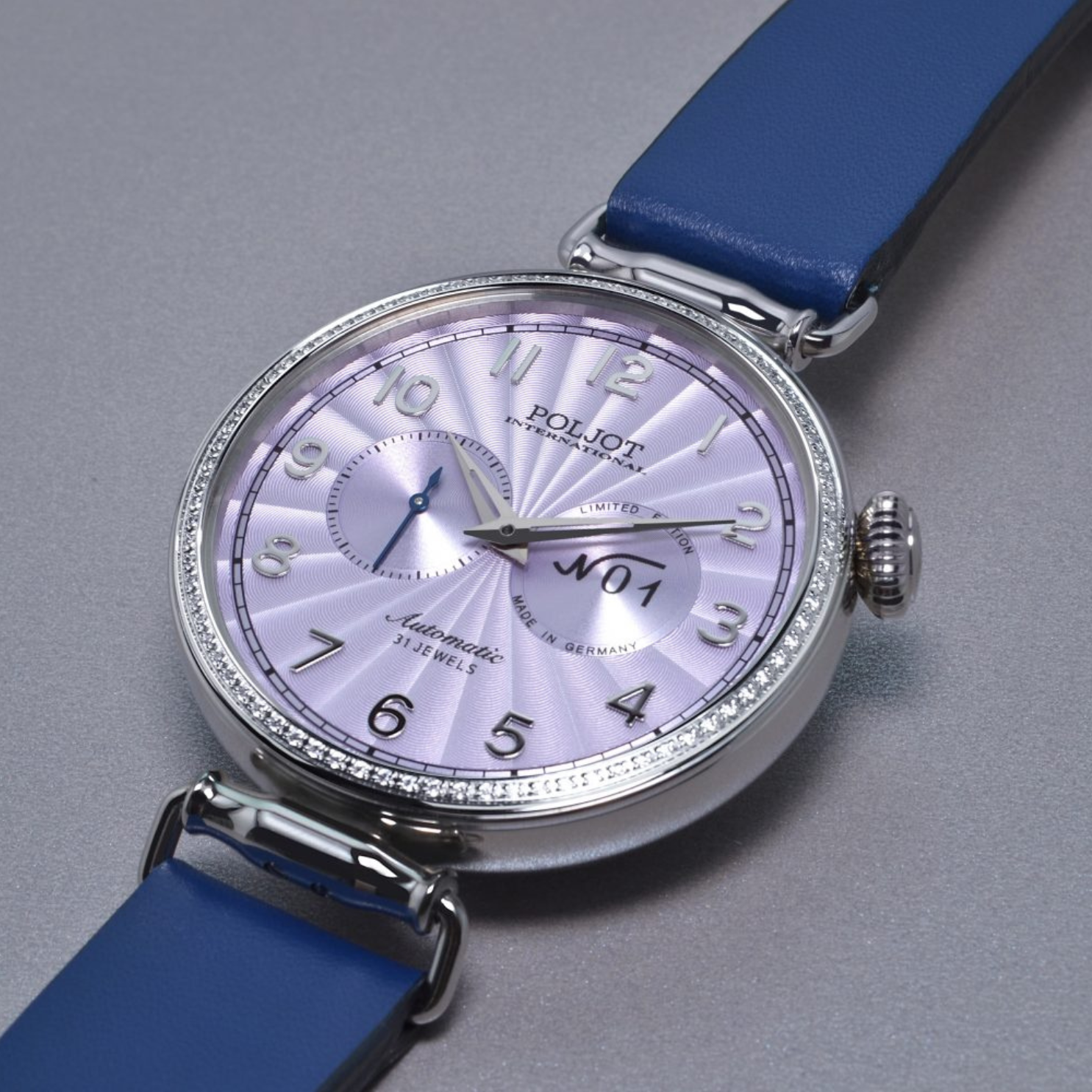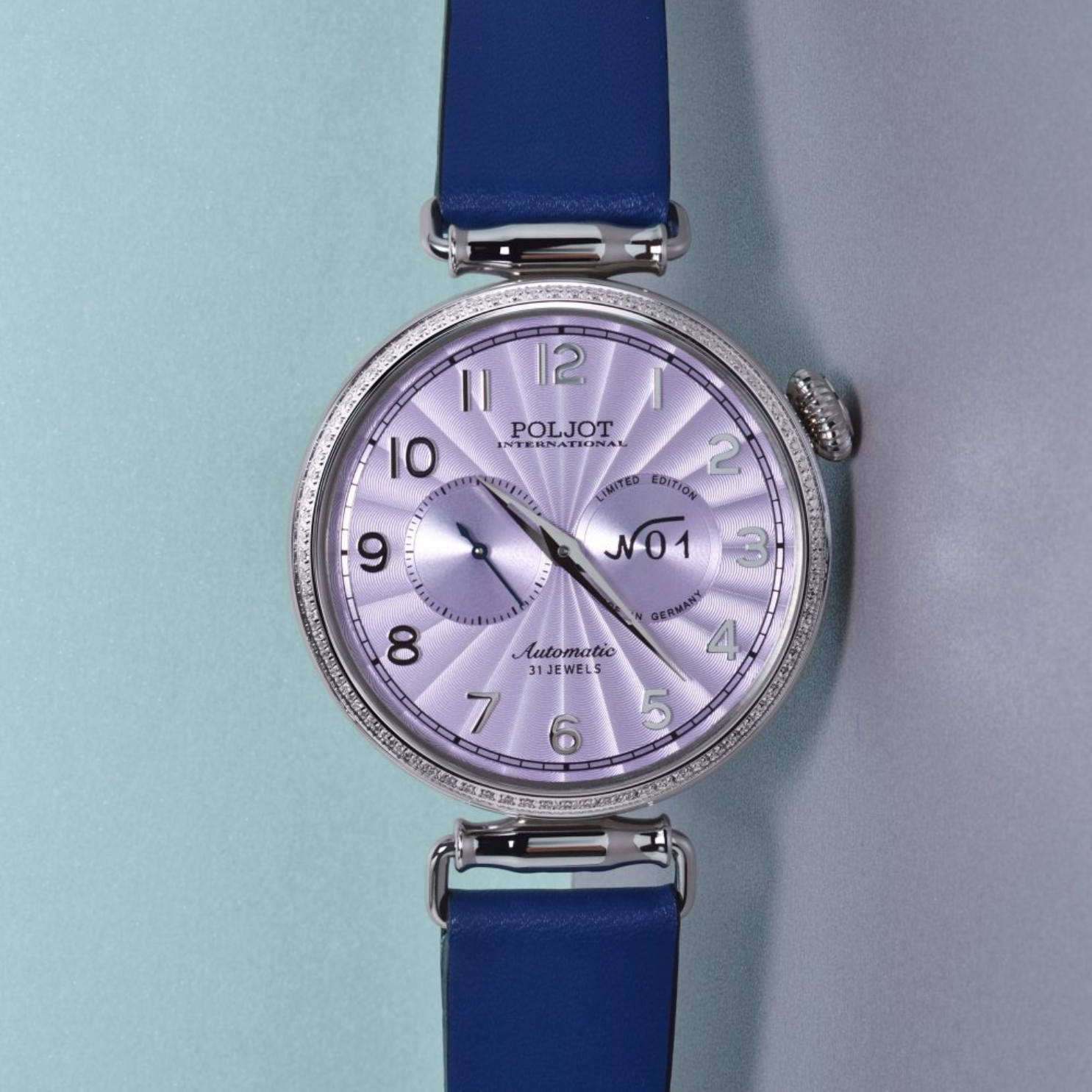 Inside the watch ticks a Vostok 2415 automatic movement with off-centre seconds at 9 o’clock. In order to be able to adjust the position of the seconds to the 9 o’clock position, as in the original, the crown was fixed to the case at 2 o’clock. In this way, the movement was turned counter-clockwise. The rotor of the movement has Geneva stripes and the screws are blued.