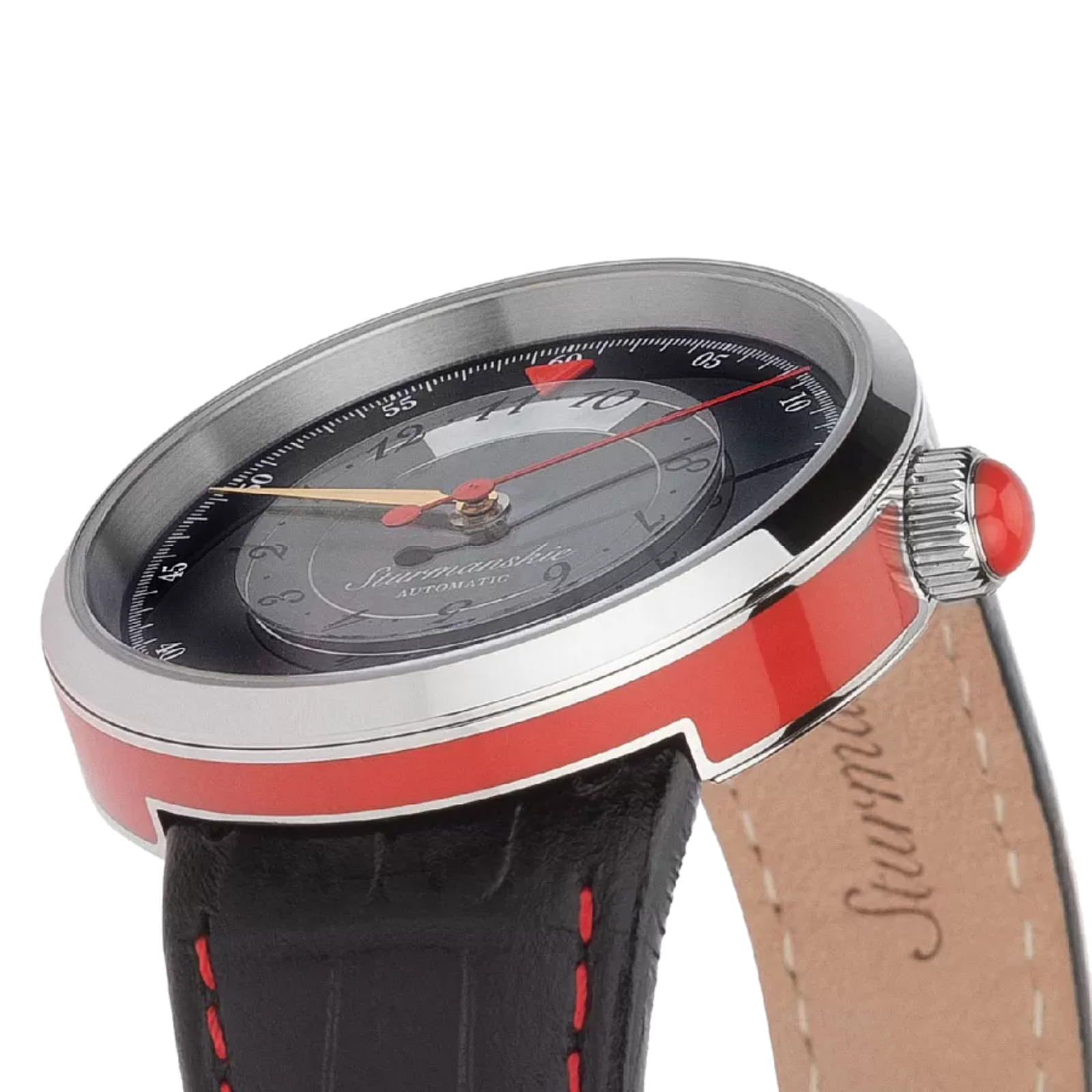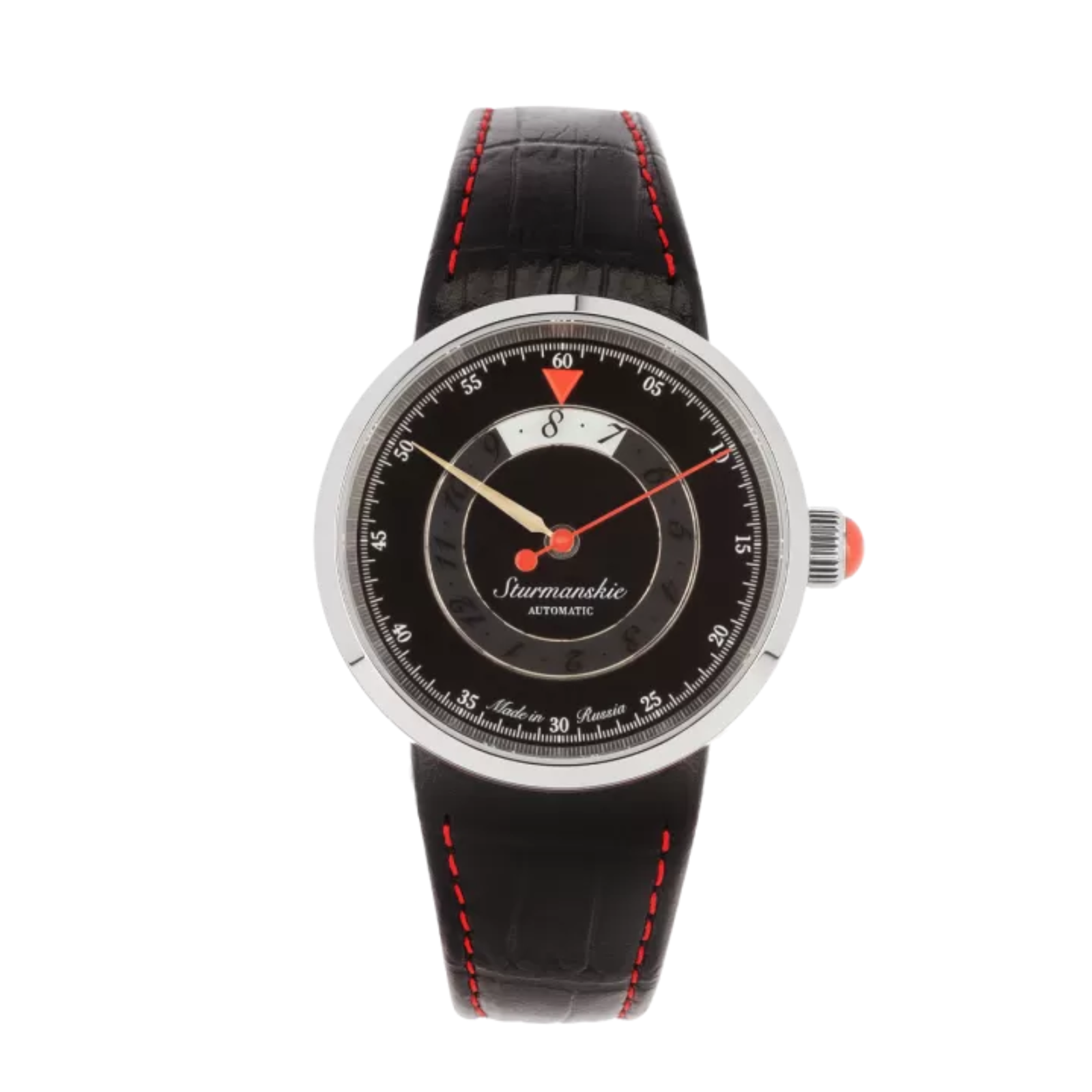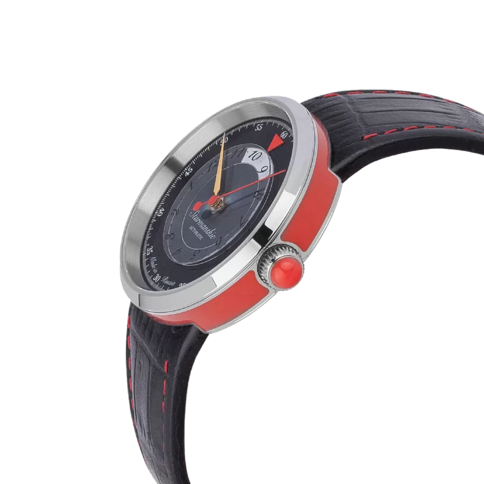 Thanks to its striking design, this watch can become a bright accessory in any of your looks. The set includes two straps – a red and a black one, both genuine leather. The strap is attached to a round stainless steel case with four bolts. The dial with unusual hour markers and coloured hands is covered with a durable sapphire crystal. The watch’s power reserve is impressive, to last 42 hours.