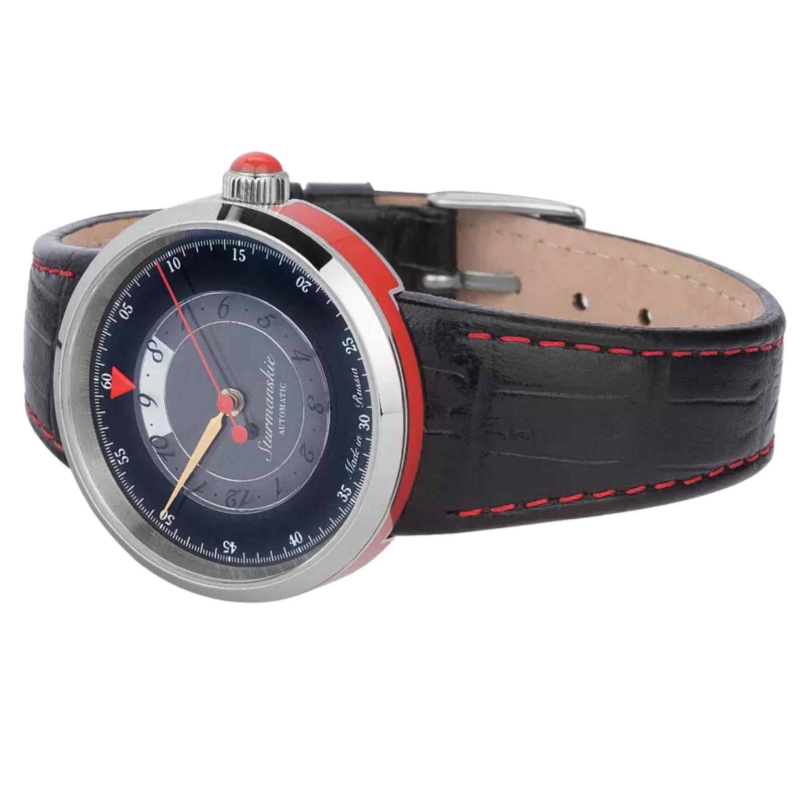 Mars Lady is a line of minimalist women’s watches designed in the spirit of the Russian avant-garde. Their distinction is in the contrasting colour combinations, handcrafted enamel finish on the case, and a bright triangle on a rotating transparent disc to read the time. The watches are powered by the Japanese mechanical Miyota 9015 calibre with automatic winding.