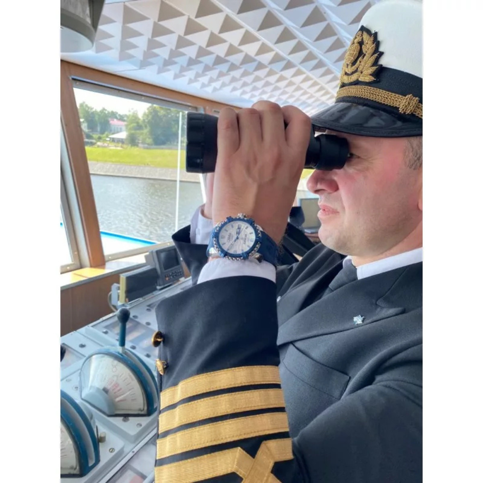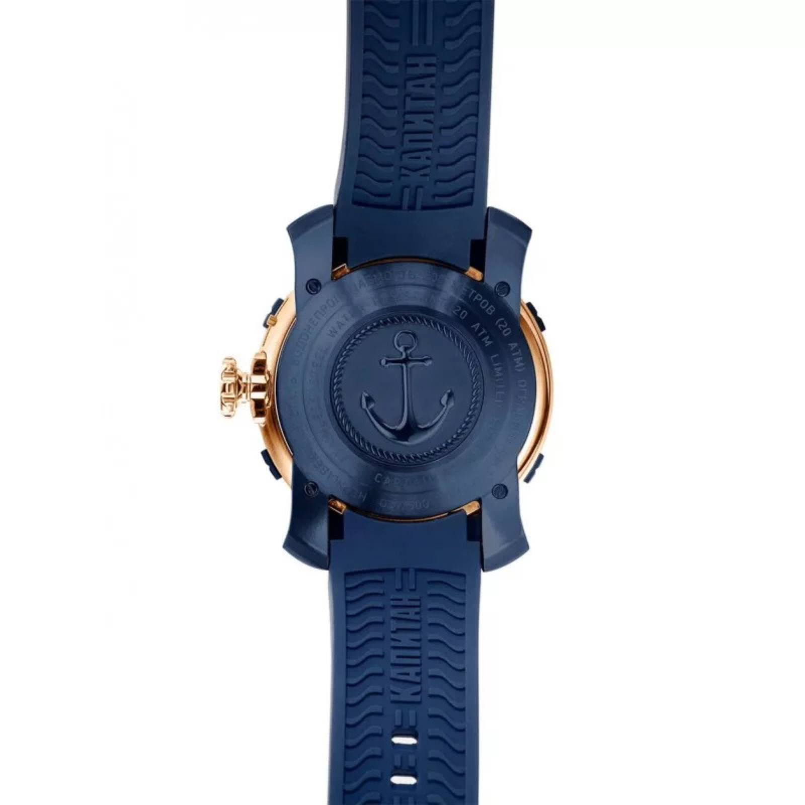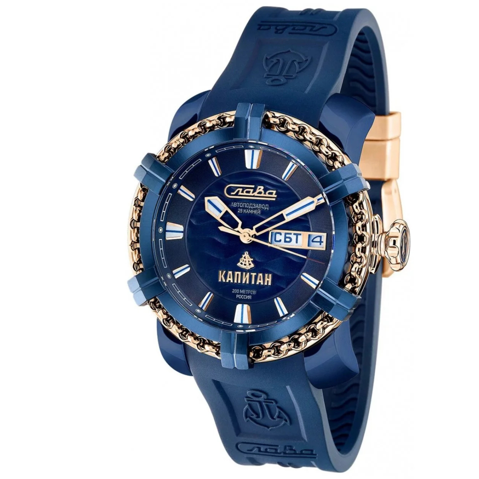 A highly collectible and rugged men’s watch, this Limited Edition Slava “Kapitan” is powered by the Russian Slava 2427 self-winding mechanical movement. It features a striking golden steel case and a bold blue dial, combining style with durability. The watch is built with a scratch-resistant sapphire crystal, a double calendar, and offers reliable $20 \text{ ATM}$ water resistance.