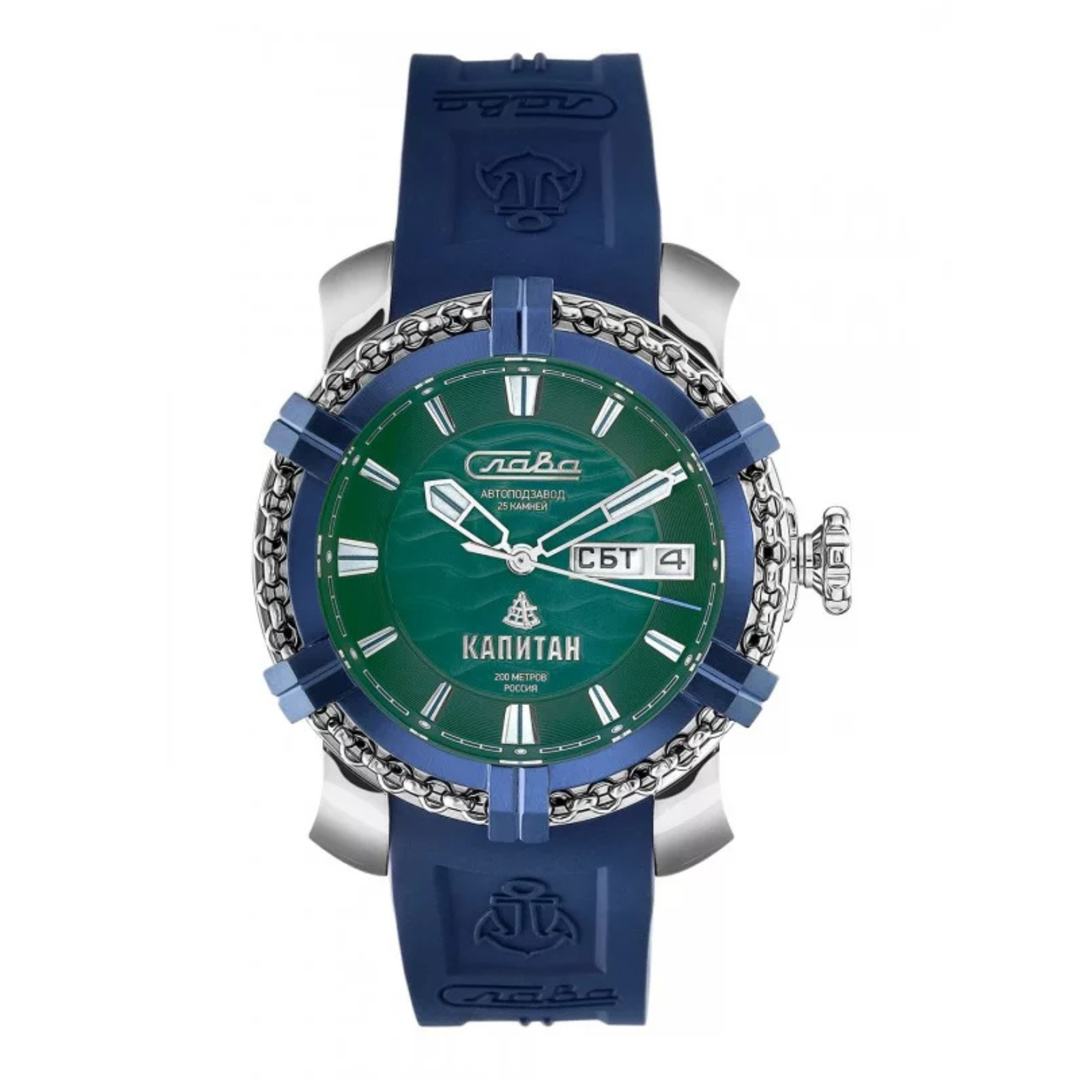Own a piece of history with this Limited Edition Slava “Kapitan” automatic mechanical watch. Powered by the robust Russian Slava 2427 self-winding movement, this timepiece is built with a sturdy $44 \text{ MM}$ stainless steel case and impressive $20 \text{ ATM}$ water resistance. The model features a distinct green dial, a double calendar (day/date), and a sapphire crystal, blending collectible exclusivity with reliable performance.