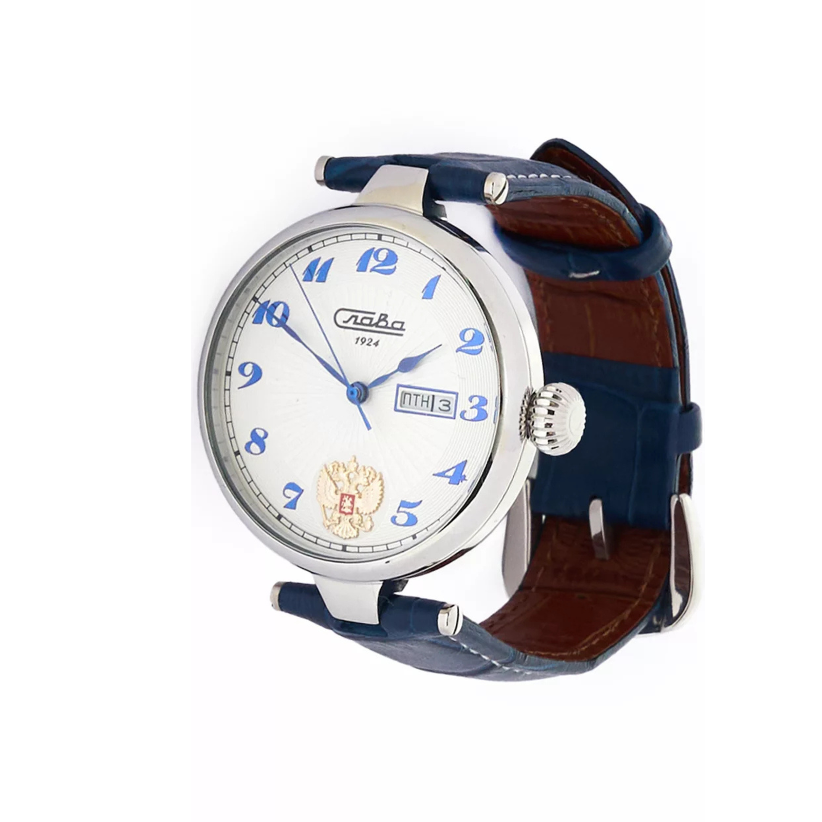 The Slava “Premier” is a classic and reliable timepiece suitable for unisex wear. It is powered by the dependable Miyota 8205 automatic mechanical movement (self-winding) and features a clean white dial. This watch provides excellent utility with a double calendar that displays both the date and weekday. The face is protected by mineral glass with a sapphire coating, and the $41 \text{ mm}$ stainless steel case is paired with a natural leather strap.