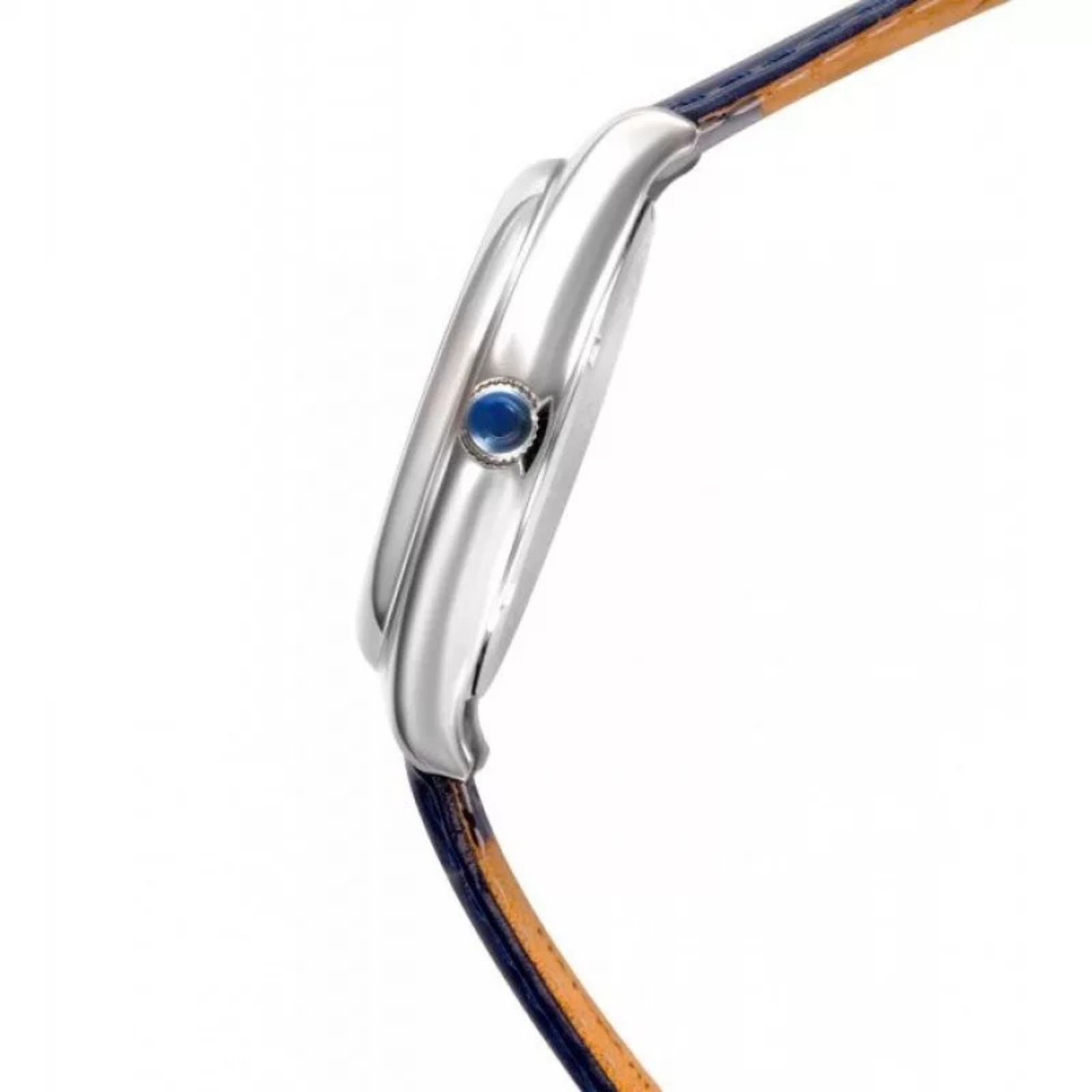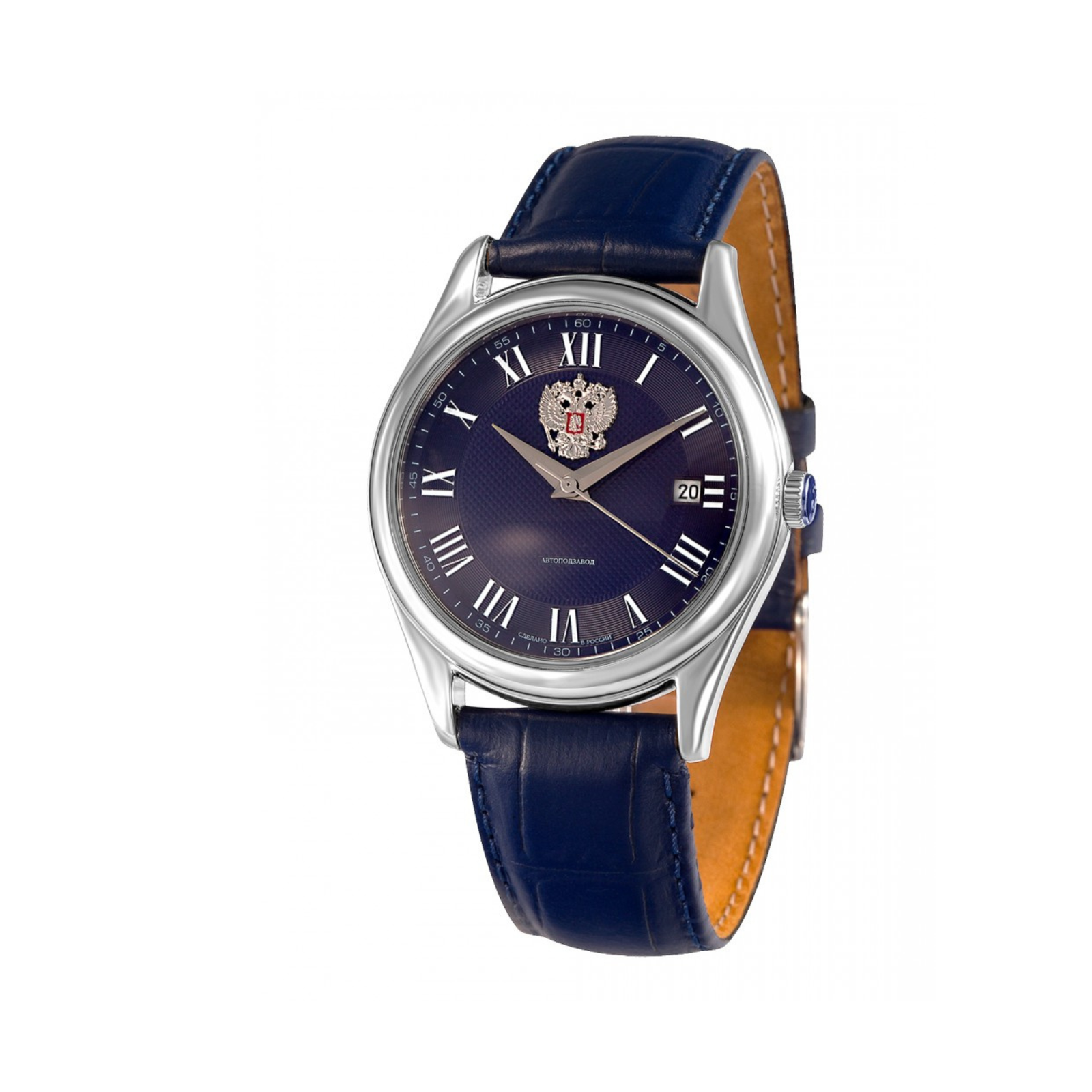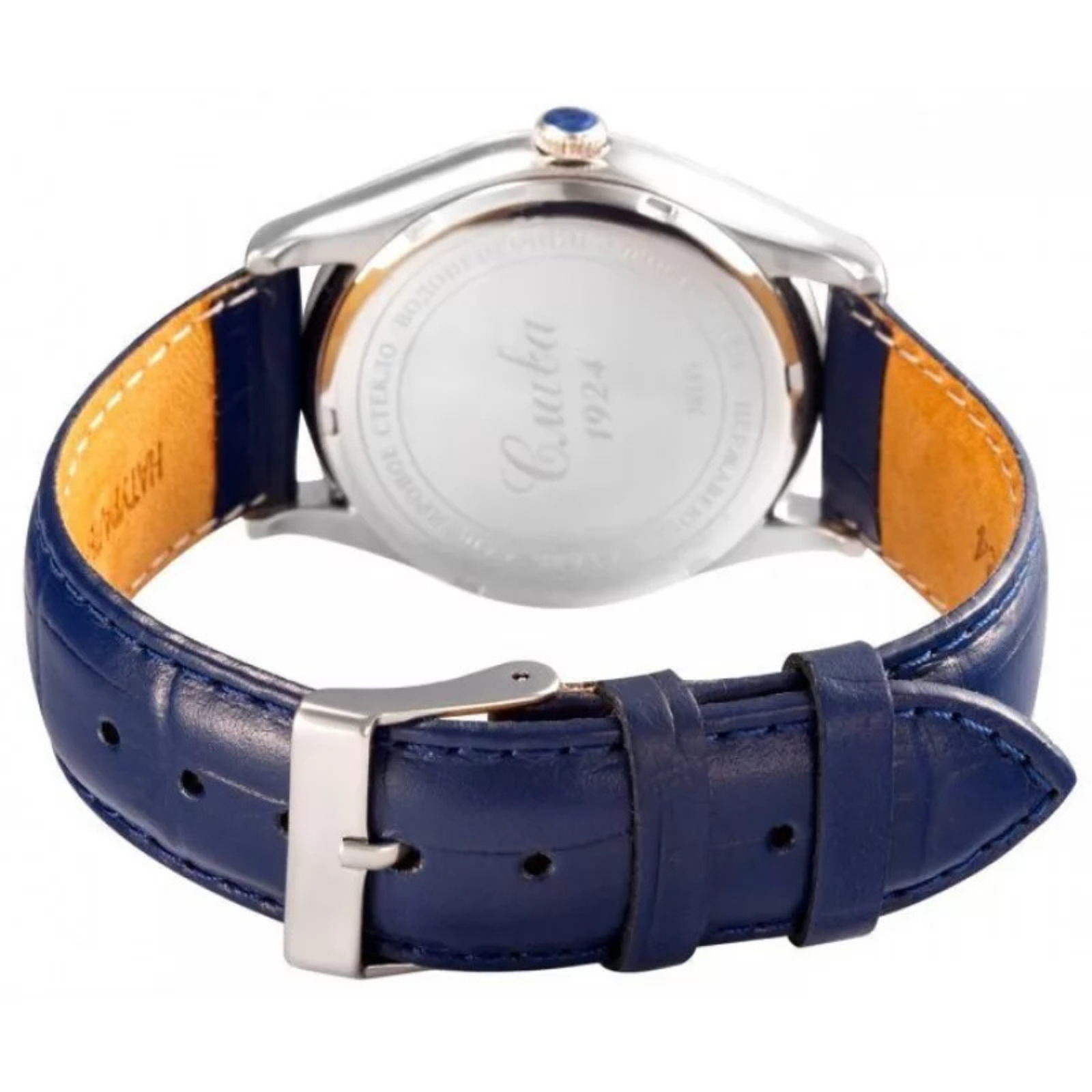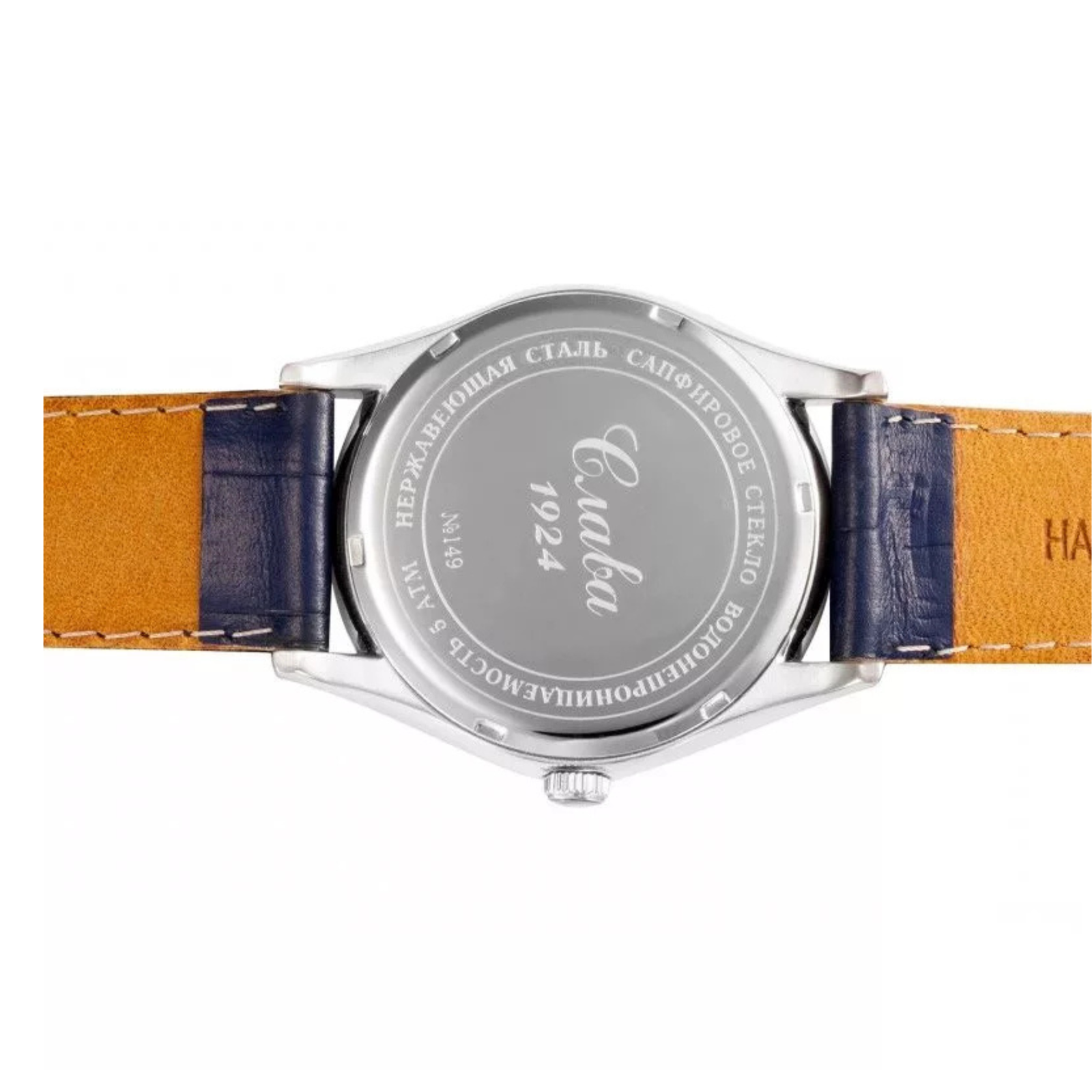 The Slava “Senat” is a sophisticated men’s timepiece featuring the highly reliable Japanese Miyota 8215 automatic mechanical movement (self-winding). Designed for a classic aesthetic, this model showcases a striking blue dial and a slender $38 \text{ mm}$ stainless steel case. It includes a practical date display and is finished with a natural leather strap, all protected by a scratch-resistant sapphire crystal.