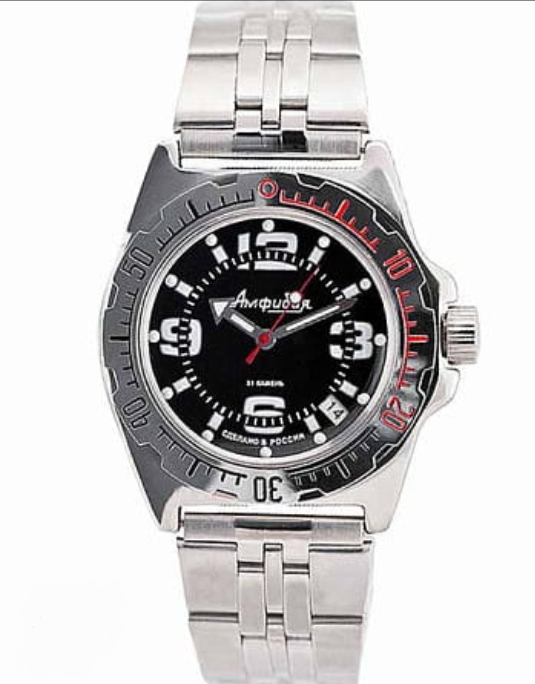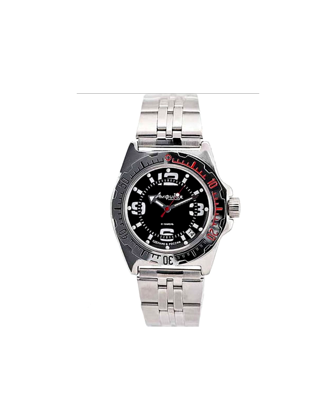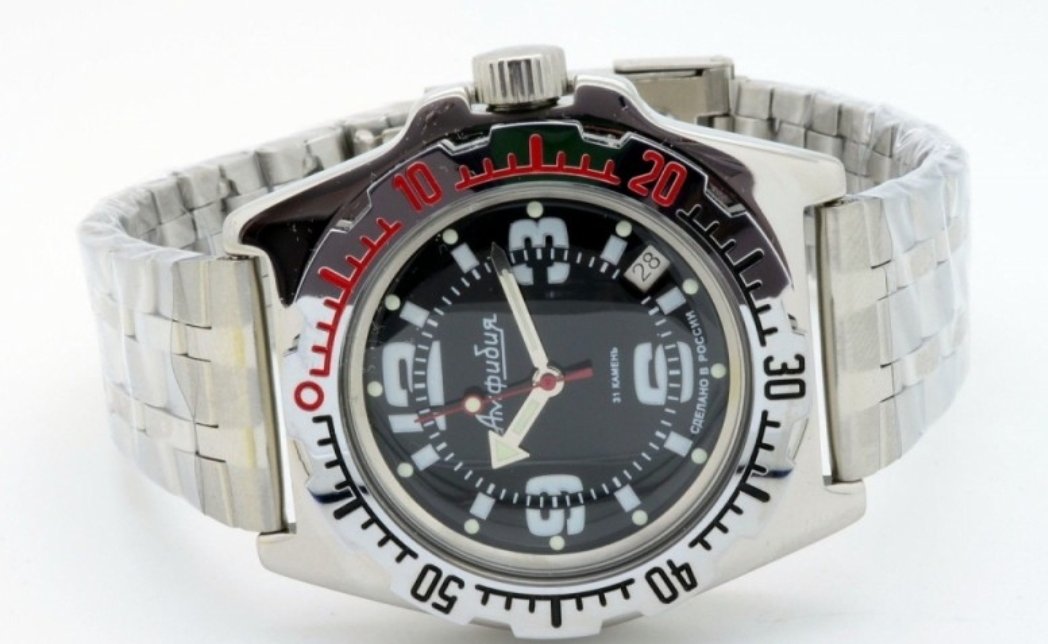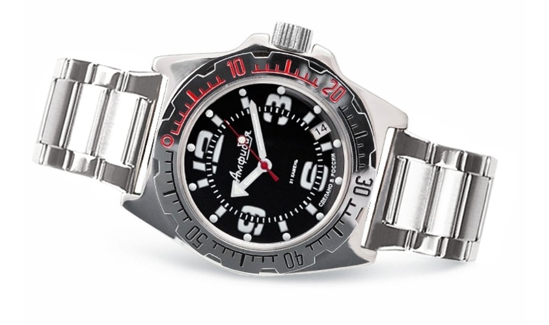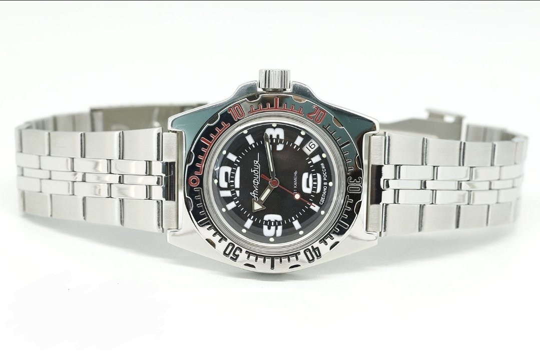 This Vostok model is a mechanical automatic wristwatch designed for intensive everyday use and water activities. It features a large stainless-steel case, a solid metal bracelet, and a reliable in-house movement equipped with shock protection and an instant date function.