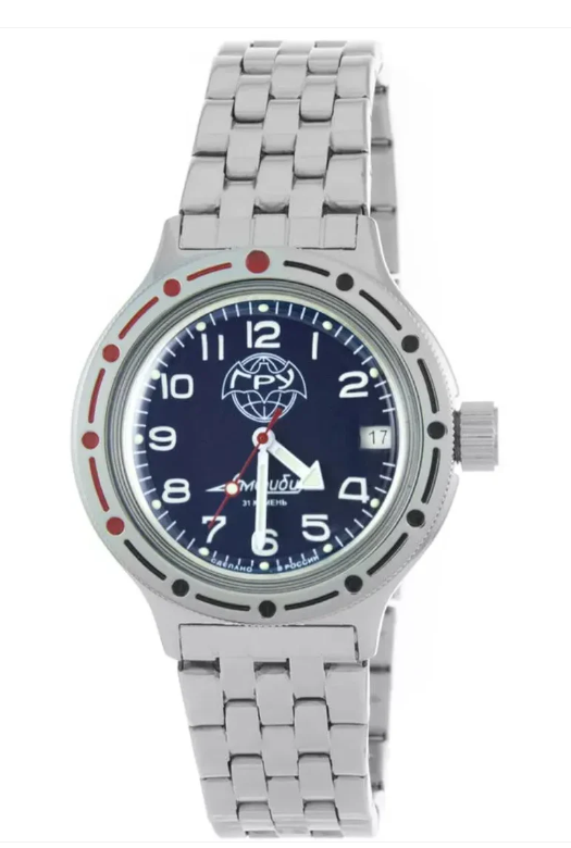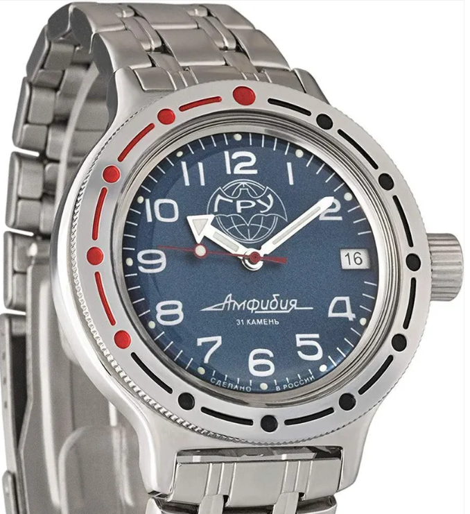 This Amphibia model is dedicated to the GRU (Main Intelligence Directorate of the General Staff of the Armed Forces of the Russian Federation), reflecting a military-inspired design and heritage. It is a mechanical automatic watch featuring a classic 12-hour analog dial, a central seconds hand, and a date function. Built for durability and dependable performance, it includes shock resistance, a rotating bezel, and overwind protection, making it suitable for both everyday wear and demanding conditions.