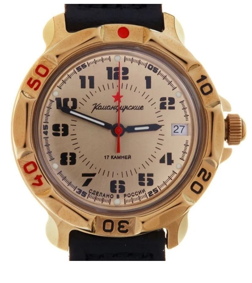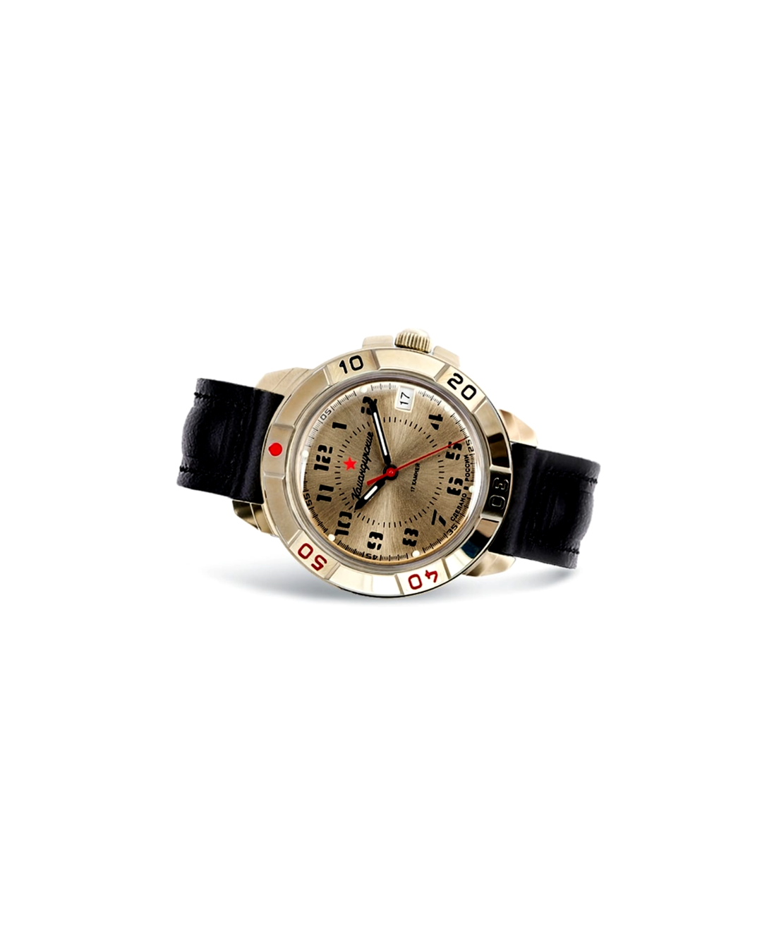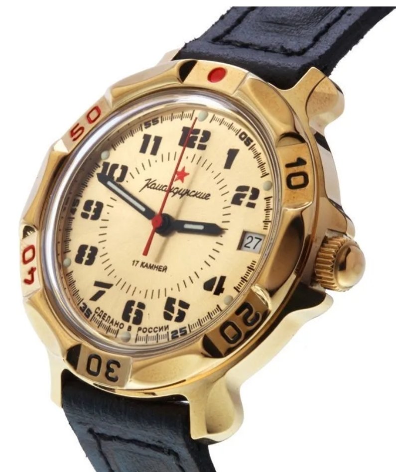 This Vostok model is a classic mechanical wristwatch designed for everyday wear. It features a brass case with titanium nitride coating, a central seconds hand, and a proven in-house movement equipped with shock protection.